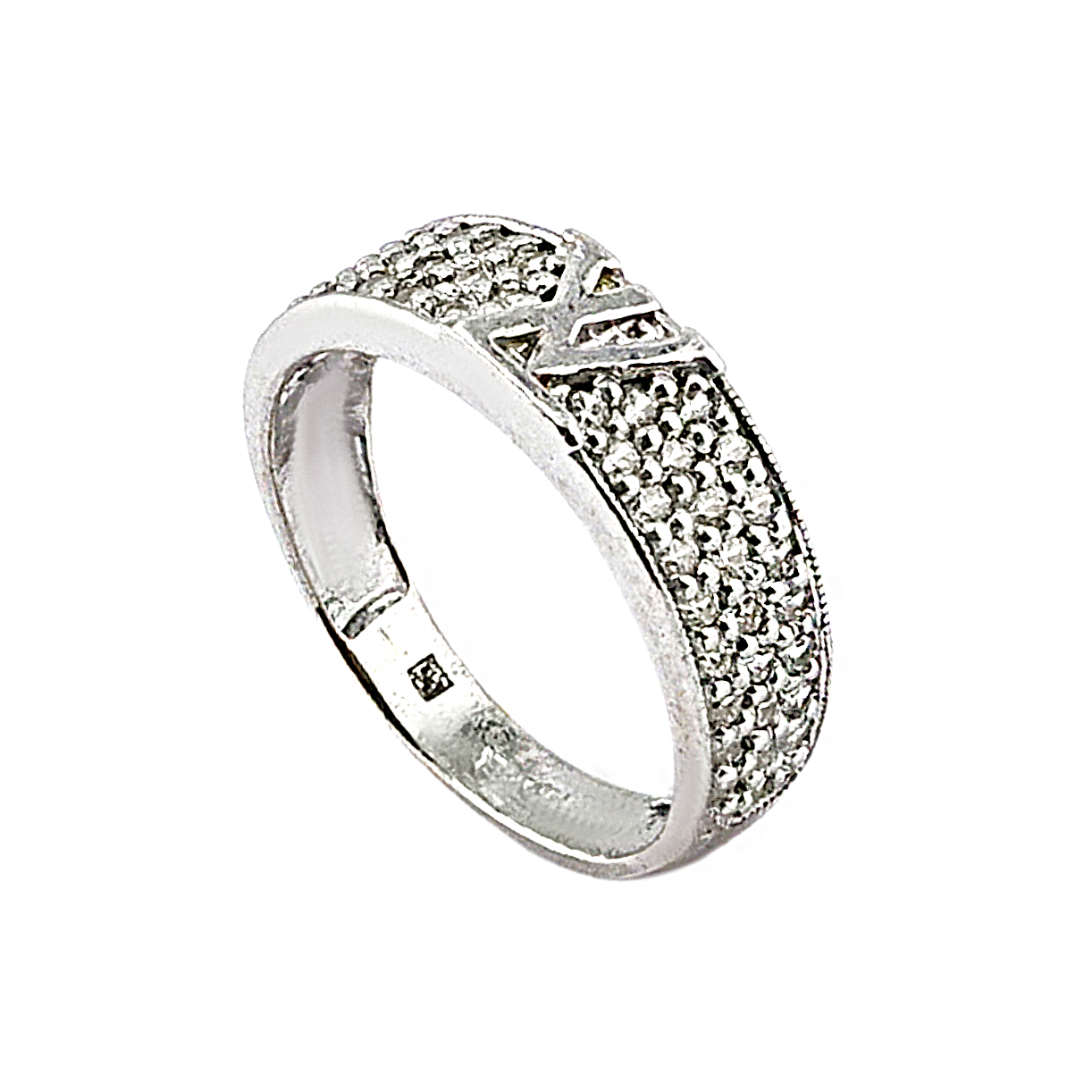 – Anel modelo LV com pedras cravejadas, banho branco, 96,5% de pureza, peso 1 salung