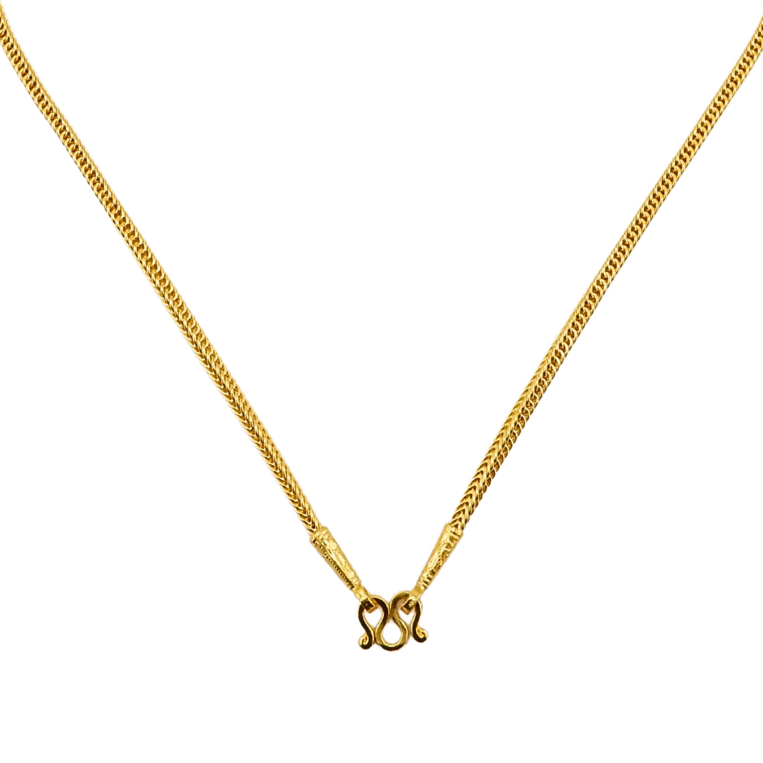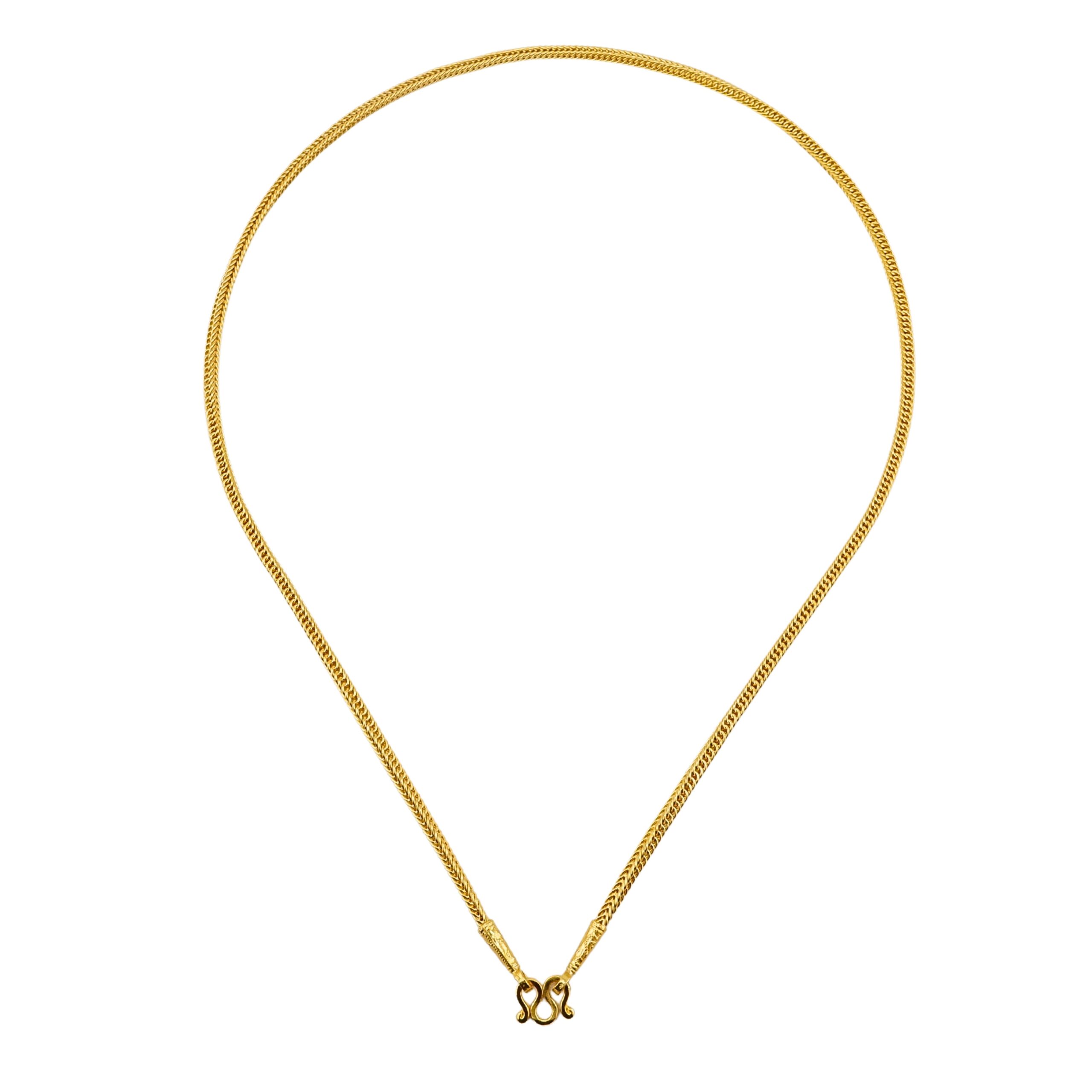 Colar com padrão Figaro, peso: 1 baht Colar com padrão de escamas de dragão, entre seções estilo Sukhothai com pedras preciosas, peso: 1 baht Colar com padrão Benz, peso: 1 baht